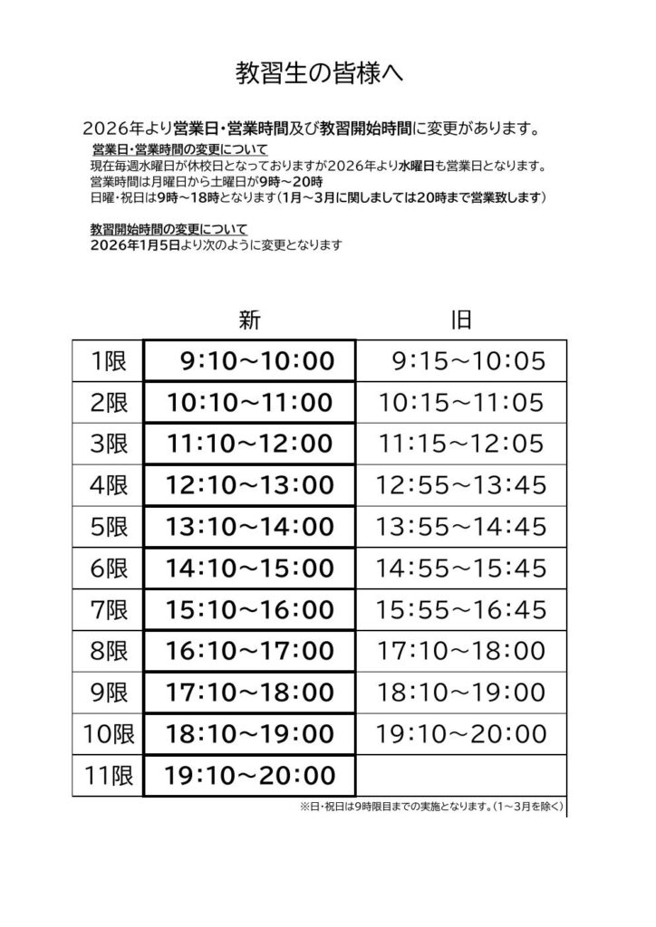 令和8年1月5日より、営業日・営業時間及び教習開始時間を下記の様に変更いたします。